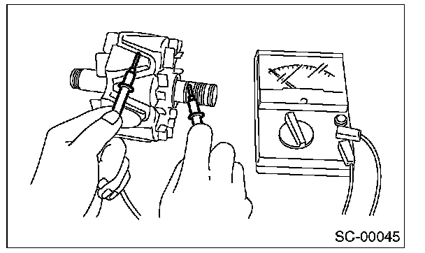 2. Check for continuity between the negative side heat sink and diode lead. If resistance is 1 Ohm or more only in the direction from the heat sink to the diode lead, replace the rectifier.