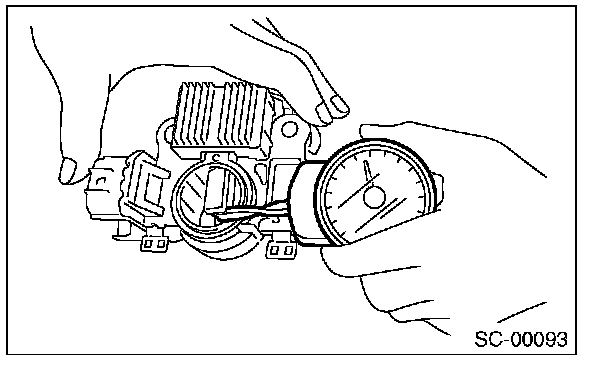2. Using a spring pressure indicator, push the brush into the brush holder until its tip protrudes 2 mm (0.08 in). Then measure the pressure of brush spring. If the pressure is 2.648 N (270 g, 9.52 oz) or less, replace the brush spring with a new part. 4.609 - 5.786 N (470 - 590 g, 16.58 - 20.810 oz) pressure is required on the new spring.