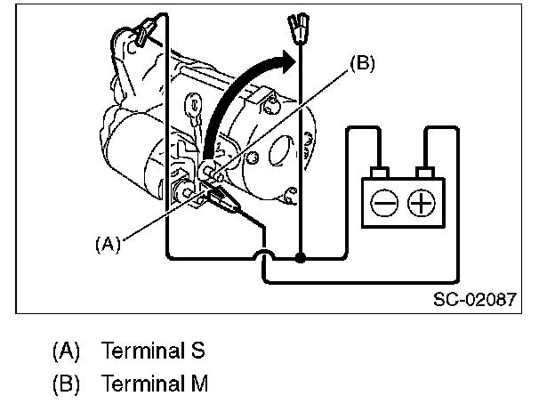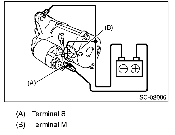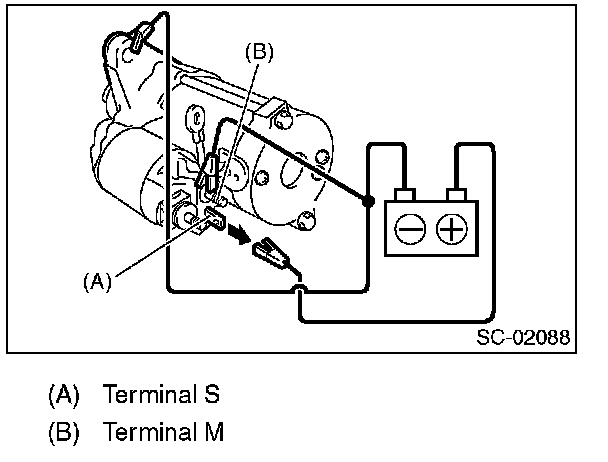 With terminal S connected to the positive terminal, and terminal M and starter body connected to the battery ground terminal to suction the main contact point, check that the pinion gear returns to its original position when terminal S is disconnected.