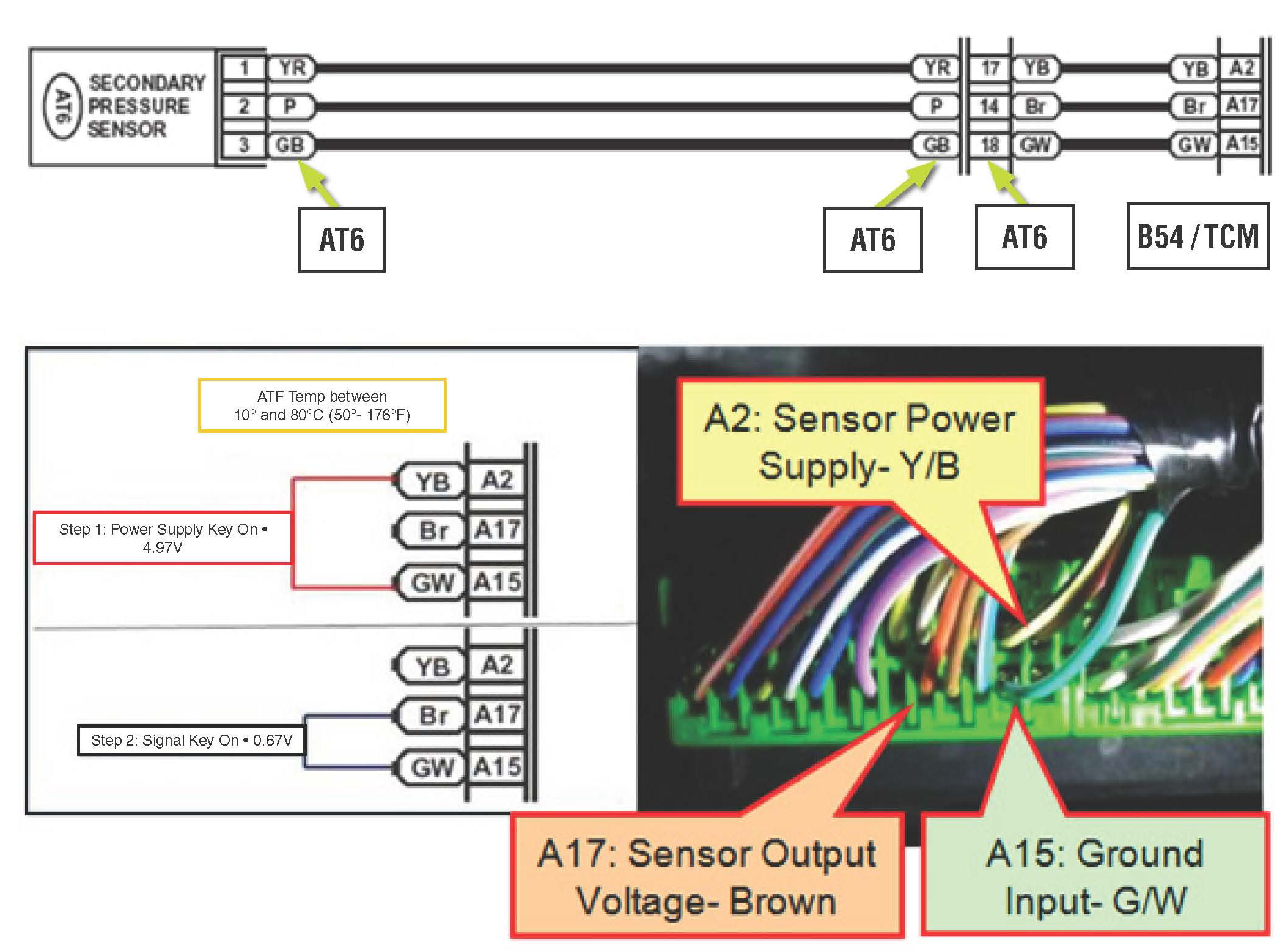 Before ordering a new TCM and / or CVT, perform these same voltage checks at the secondary pressure sensor connector (AT6) and (if necessary), the main transmission harness connectors (T4 and B11). Ruling out wiring issues will prevent repeat or unnecessary component replacements.