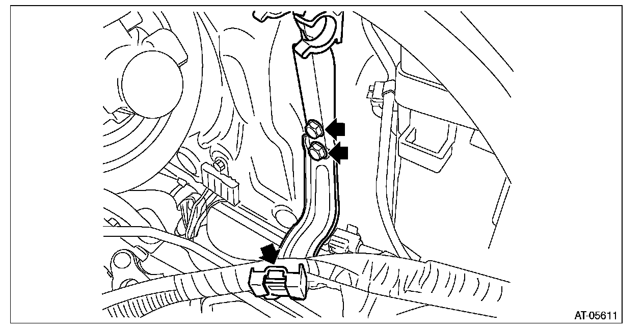 11) Remove the bolt and disconnect the engine harness connector.