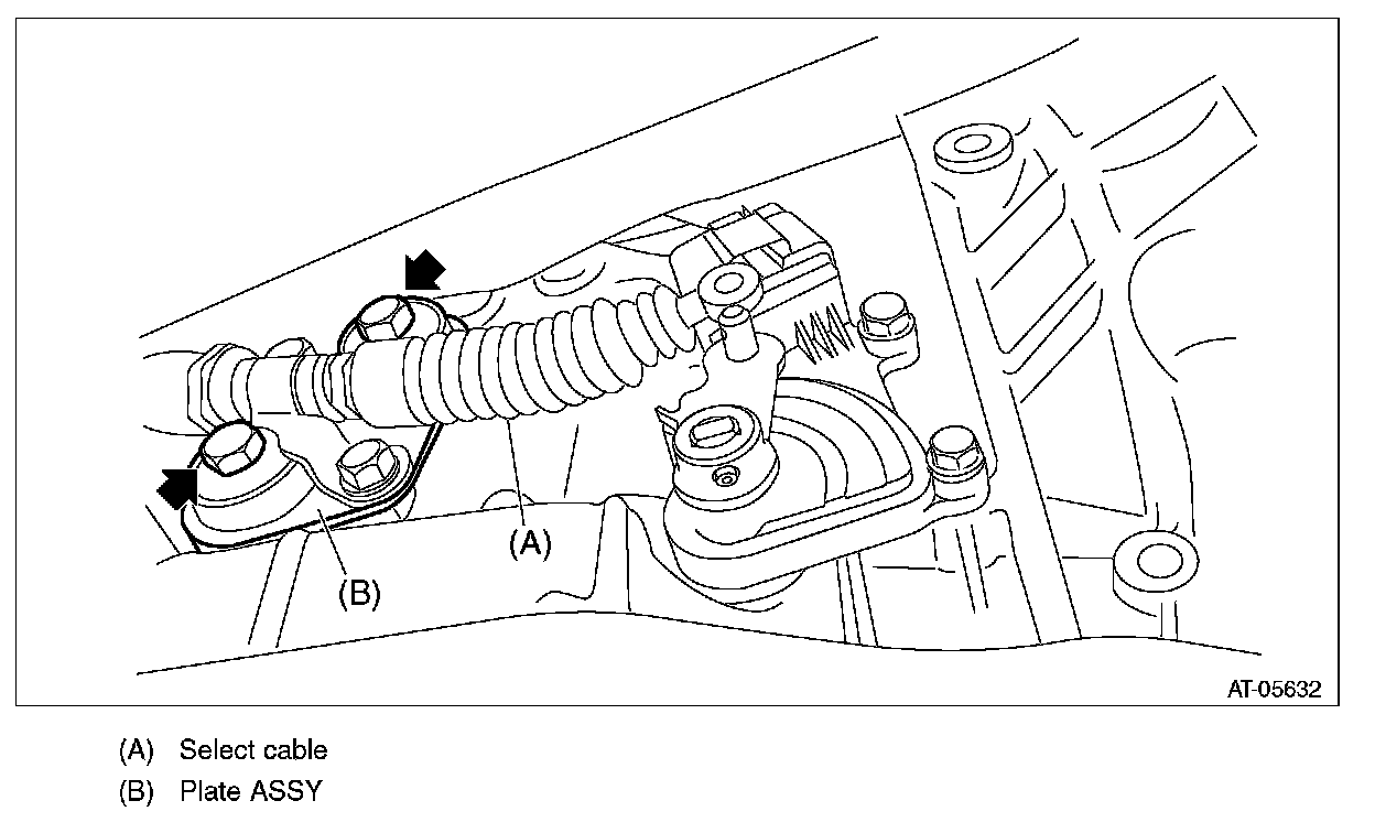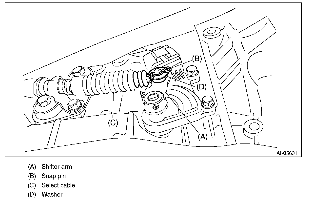 25) Remove the snap pin and washer from shifter arm and remove the select cable from shifter arm.