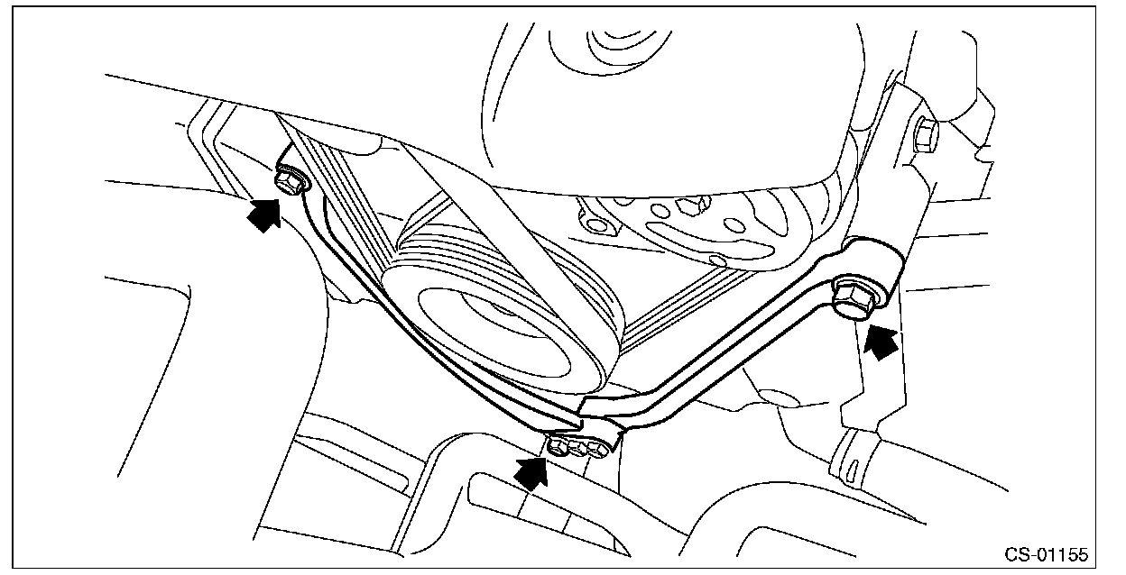 16) Remove the four bolts combining the torque converter and drive plate while rotating the crank pulley a little at a time in the same direction as engine revolution.