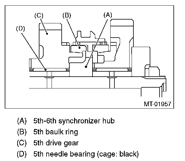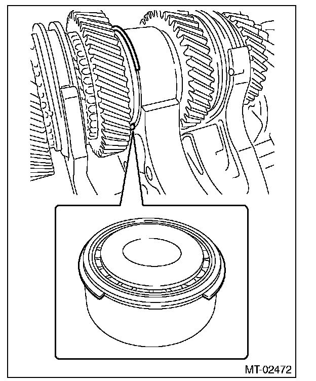 7) Install the needle bearing, 5th drive gear, 5th baulk ring, and 5th-6th synchronizer hub on the transmission main shaft.