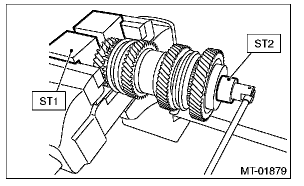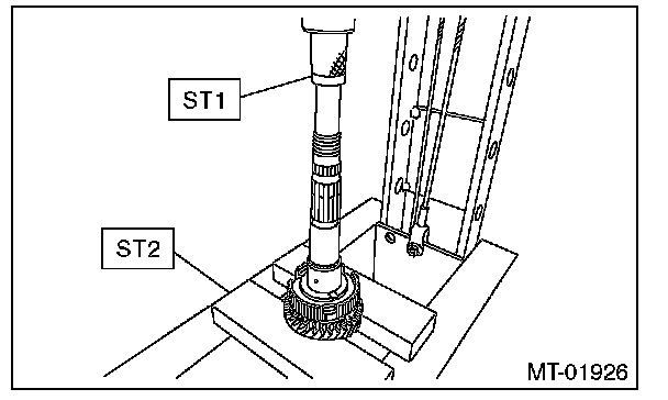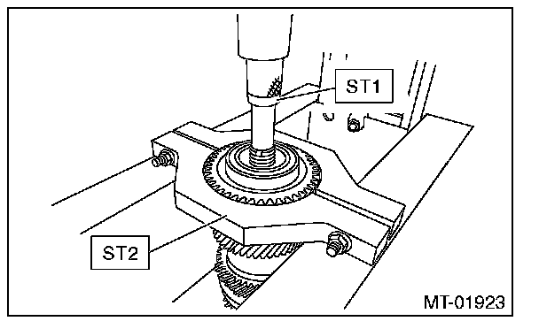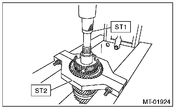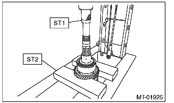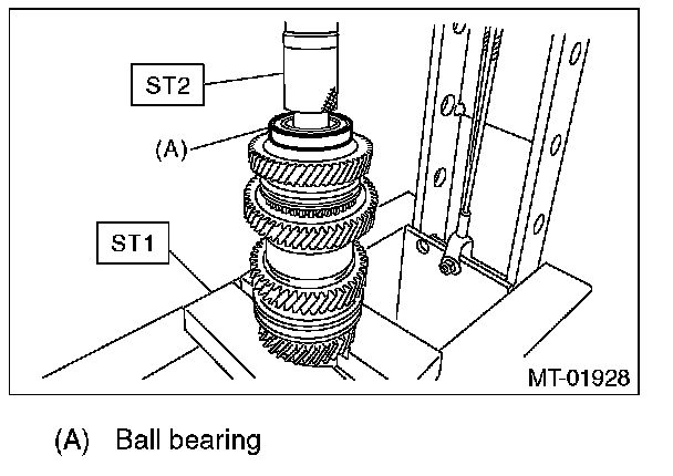10) Install the ball bearing onto transmission main shaft using ST2 and a press.