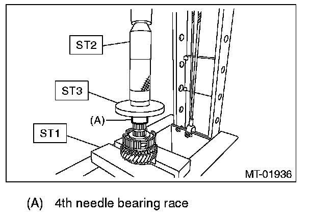 3) Install the 4th needle bearing race onto transmission main shaft using ST1, ST2, ST3 and a press.