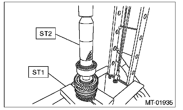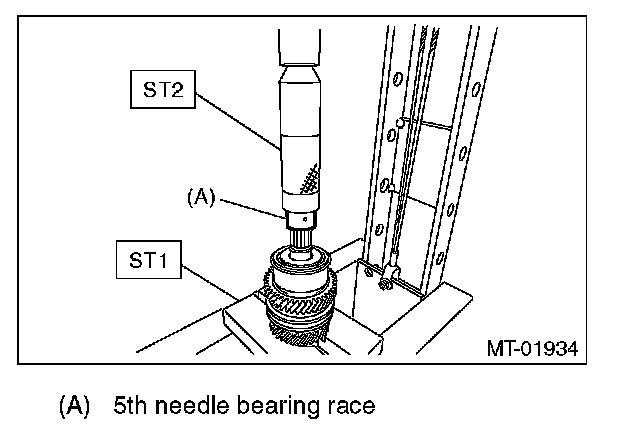 6) Install the 5th needle bearing race into the rear section of transmission main shaft using ST1, ST2 and a press.