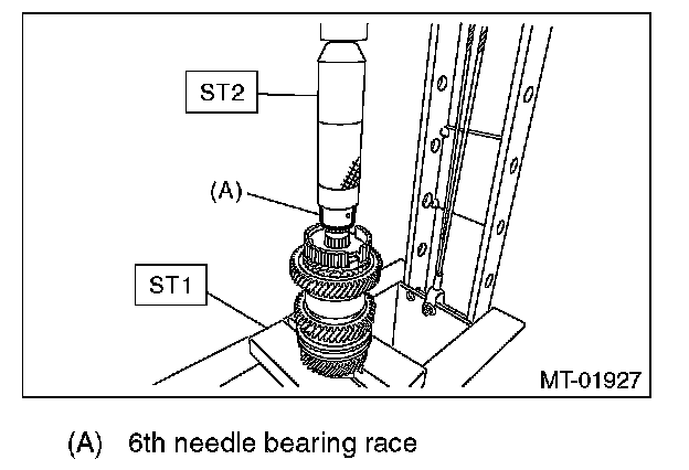 8) Install the 6th needle bearing race onto transmission main shaft using ST1, ST2 and a press.