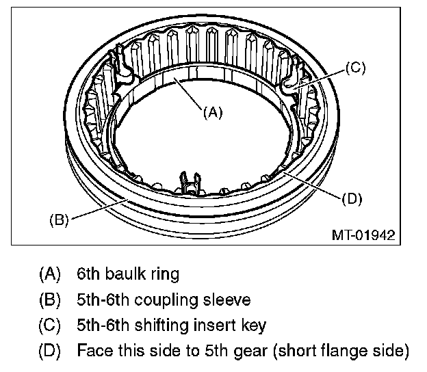 Install the 5th-6th coupling sleeve with the short flange side facing the 5th drive gear.