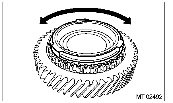 ^ Apply gear oil to the corn of the gear and while press-fitting the synchronizer ring, check there is no rotation in the circumferential direction.