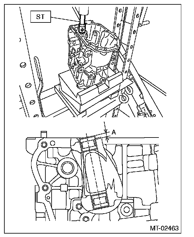 ^ Insert the iron plate which is thicker than the exposed length of the transfer case knock pin between the ST and transfer case.