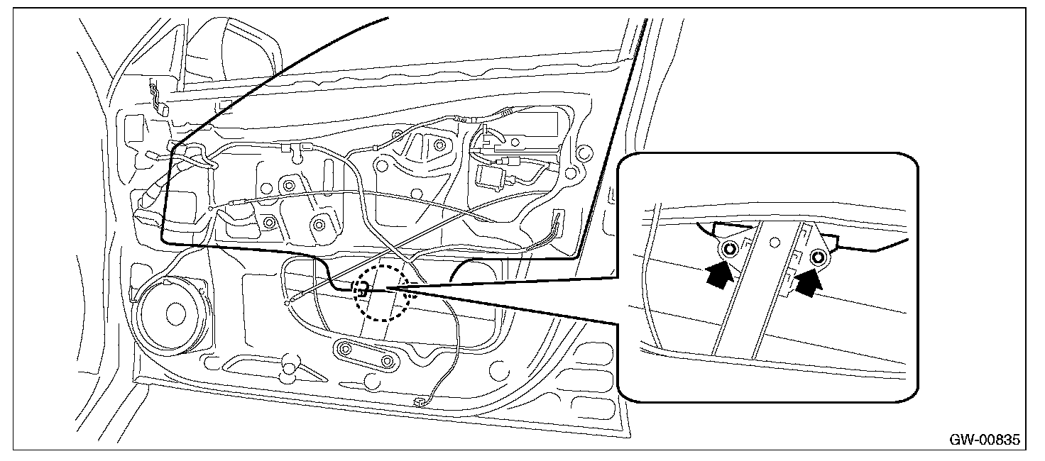 1. Operate the power window switch to move the front door glass to the position where the mounting bolts can be seen.