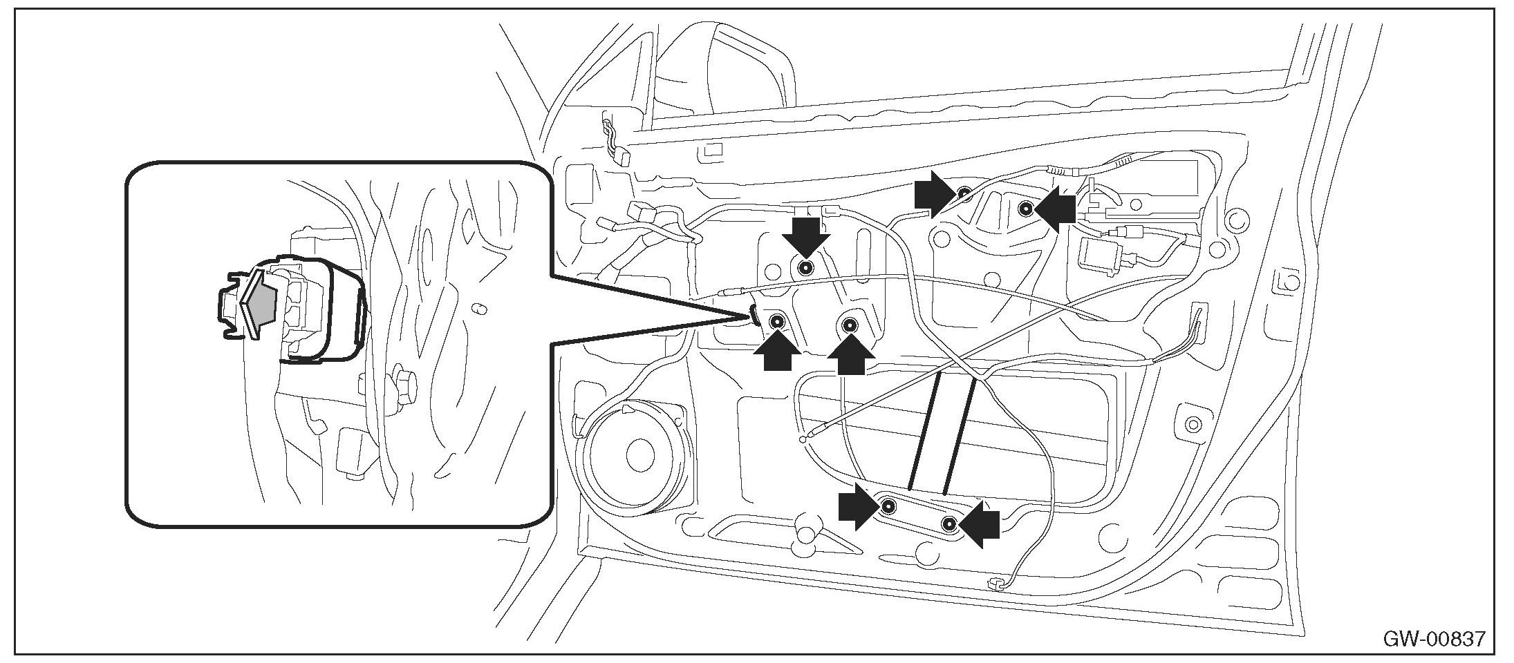 2. Remove the bolts, and then remove the front regulator and motor assembly.