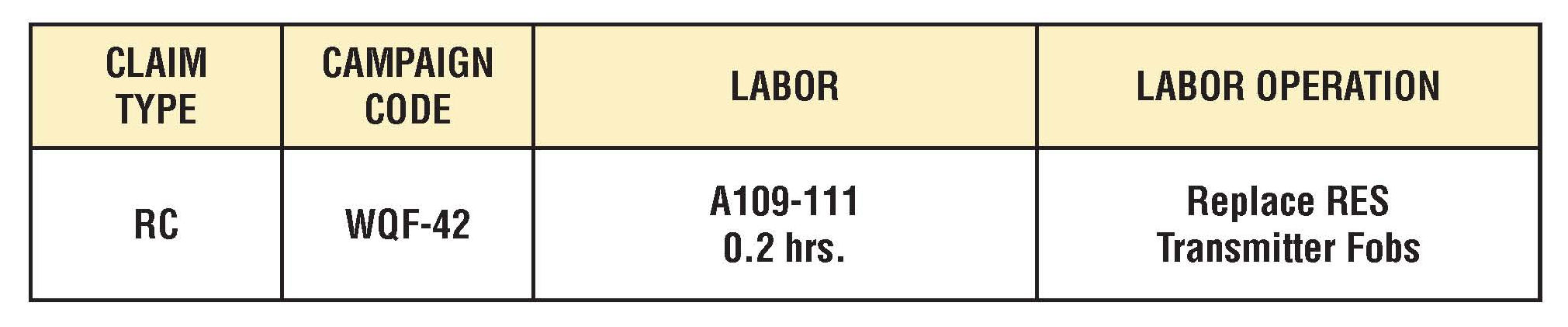 To remedy this condition, it is necessary to replace RES transmitter fobs. Recall code WQF-42 has been assigned to this recall campaign.