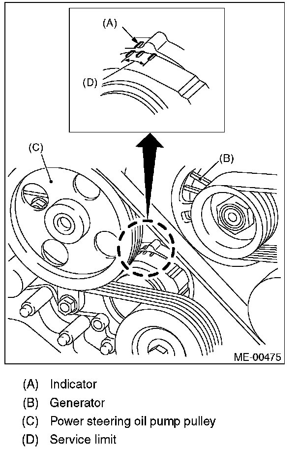 2) Make sure that the V-belt automatic belt tension indicator (A) is within the range (D).