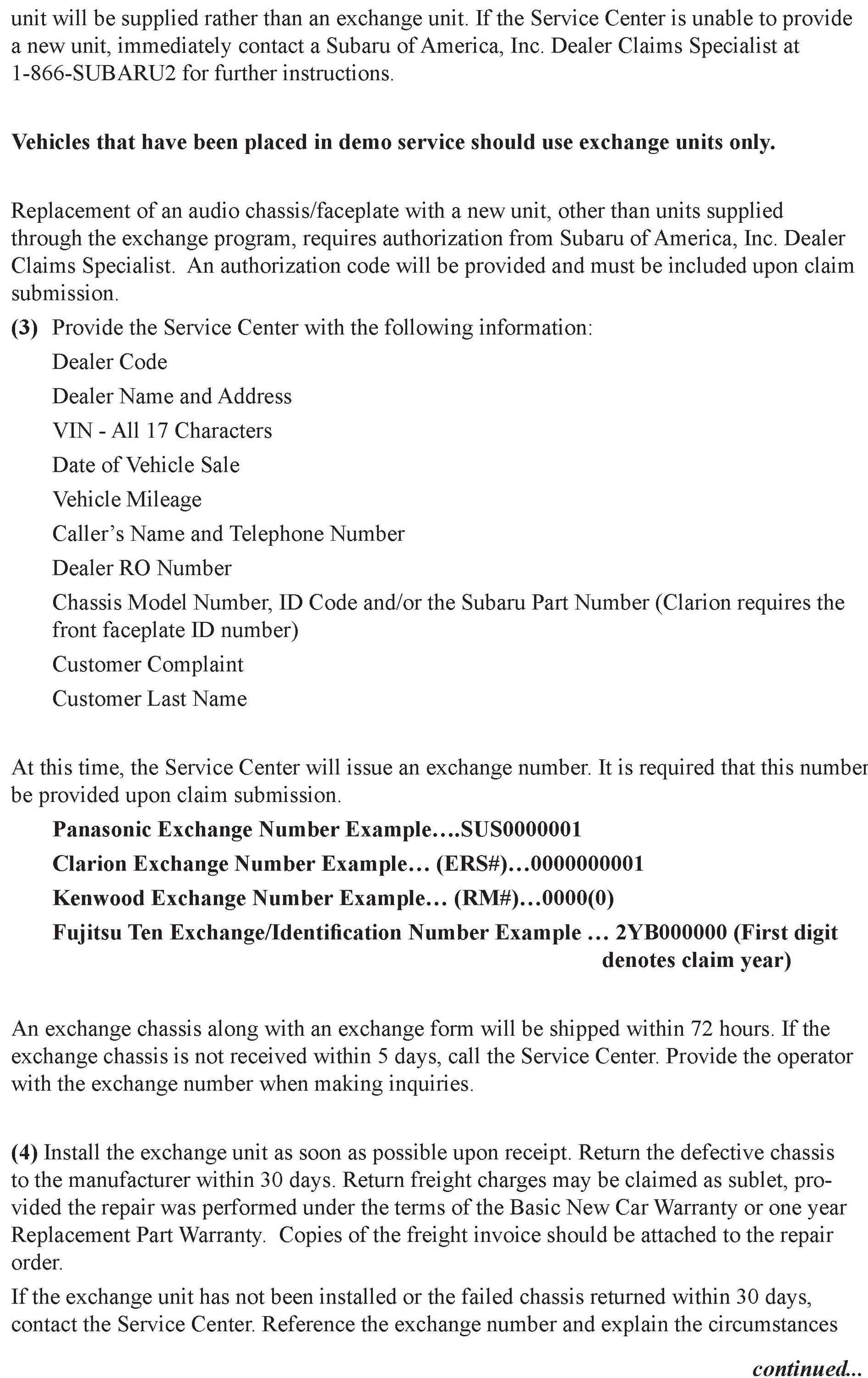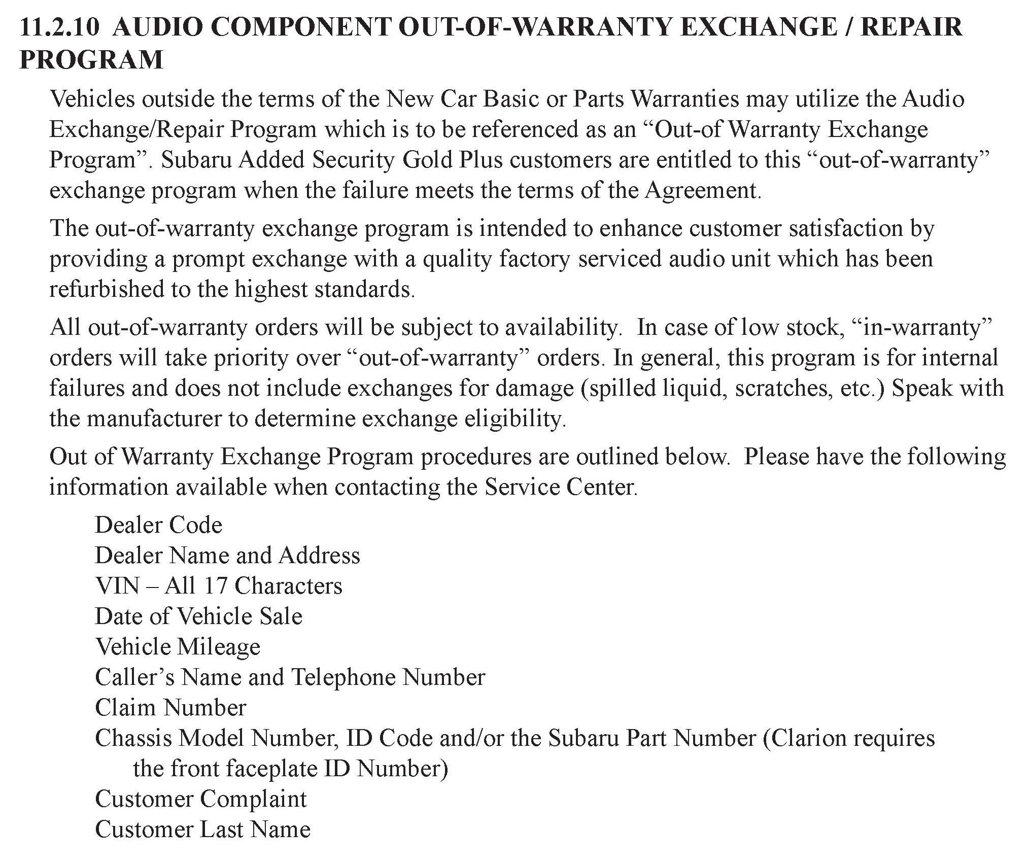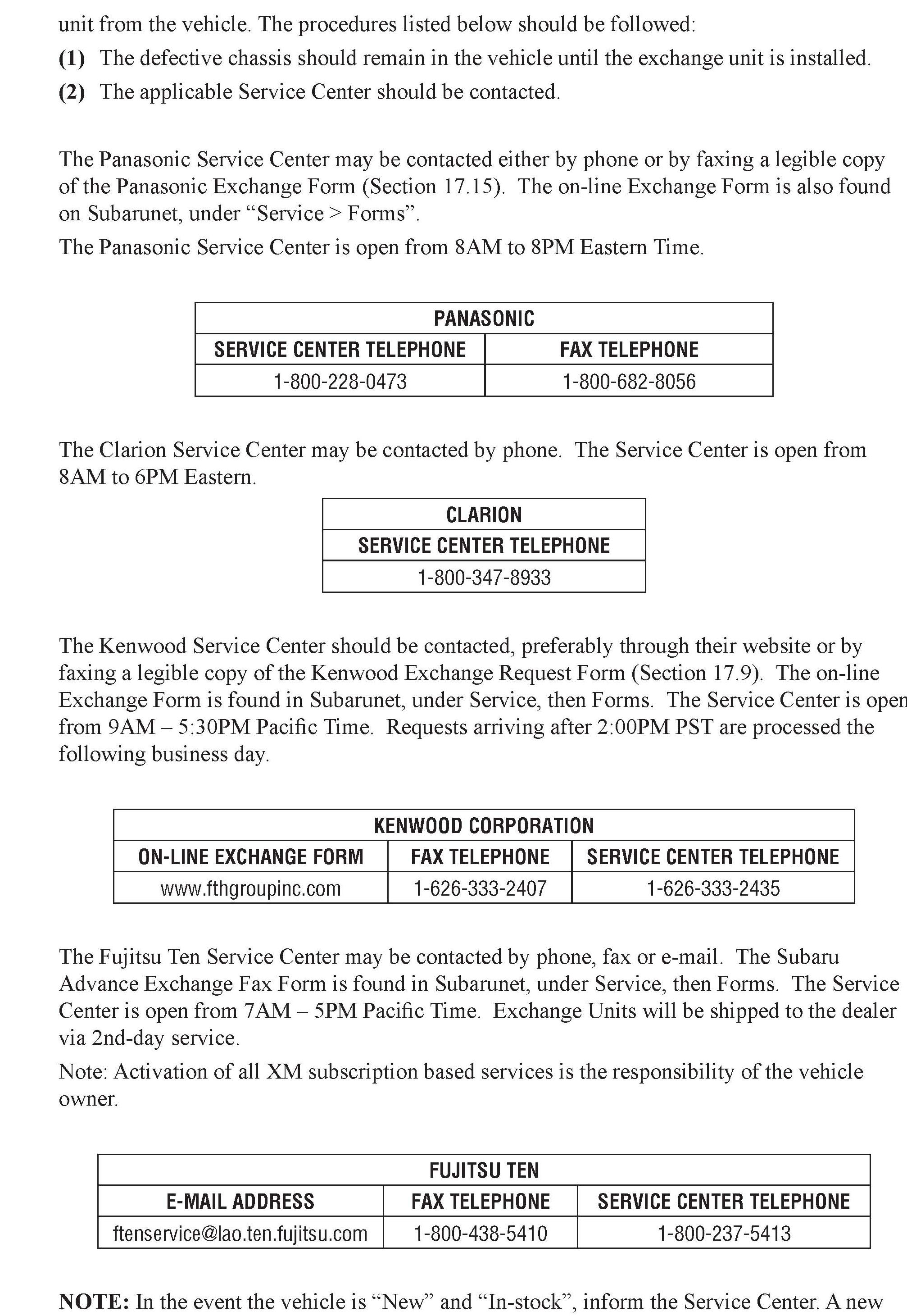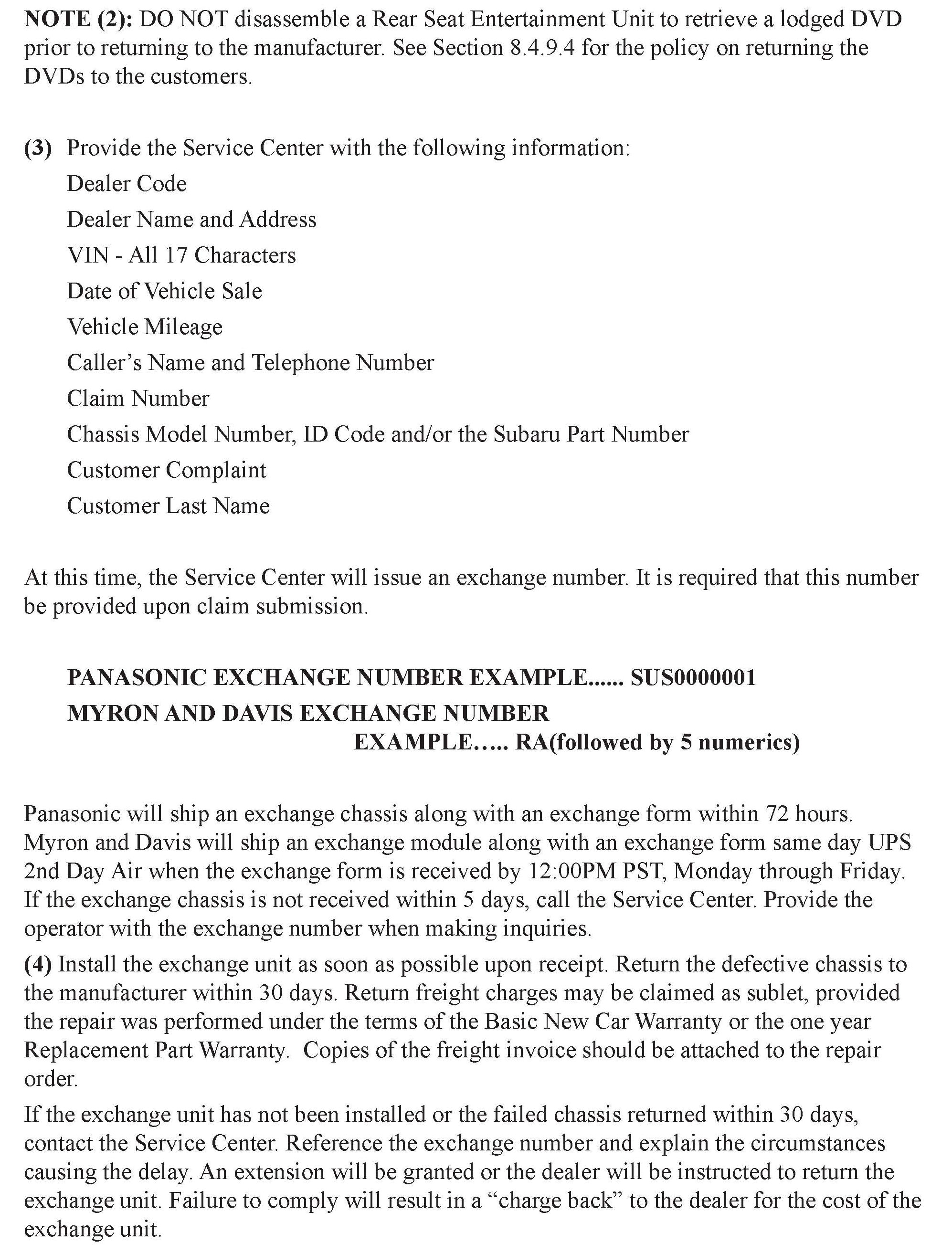 This bulletin contains illustrations of exchange components and their manufacturer as well as a description of the proper exchange procedure. The exchange program policy can also be found in Sections 8.4.9 and 11.2.10 of your Service Policies and Procedures Manual found in subarunet