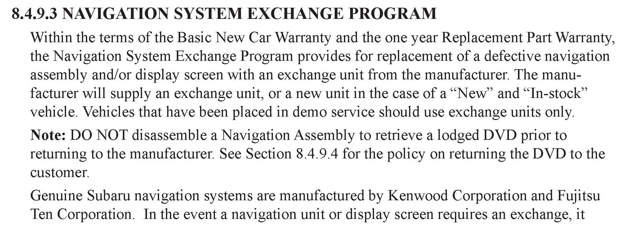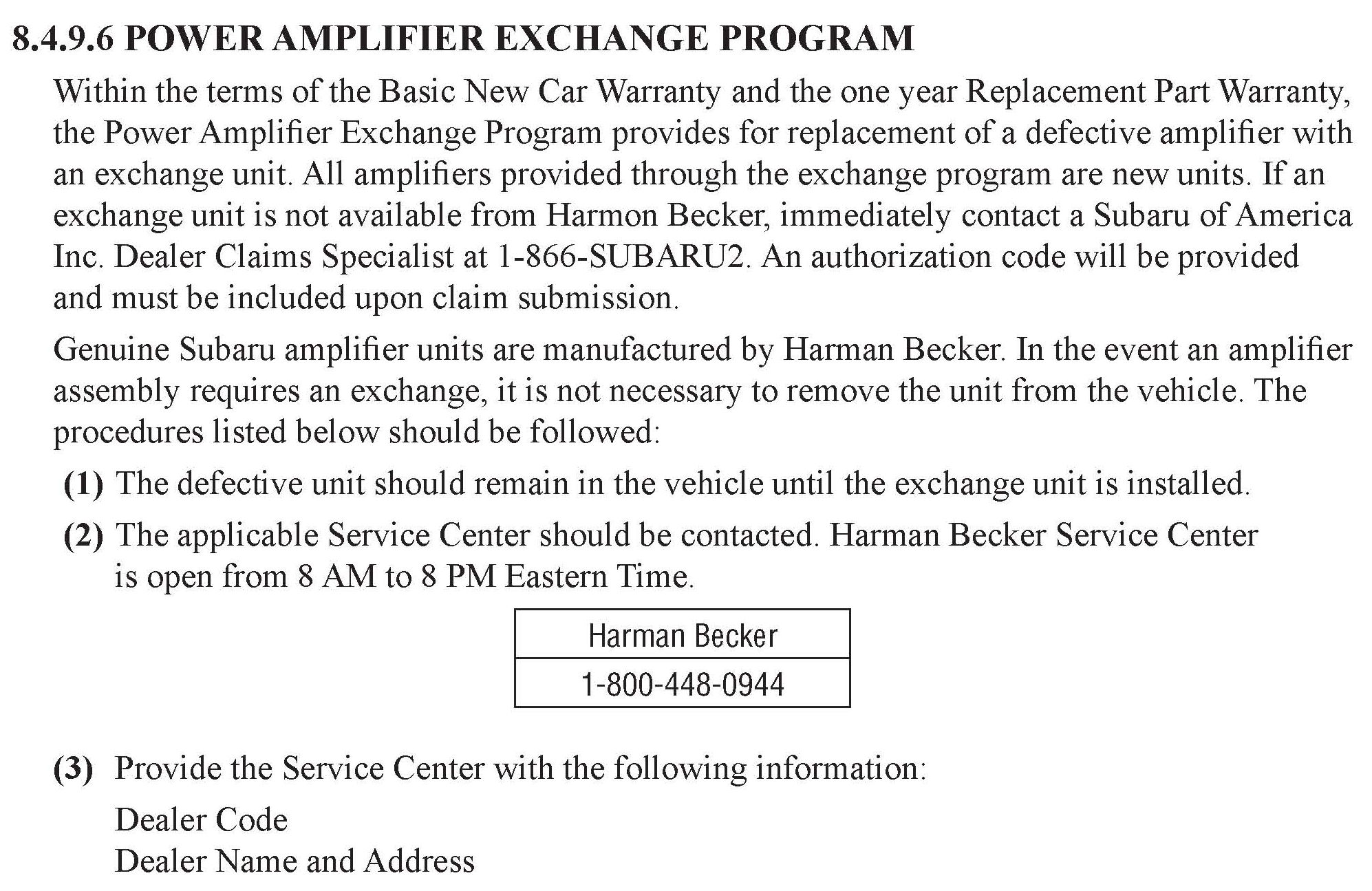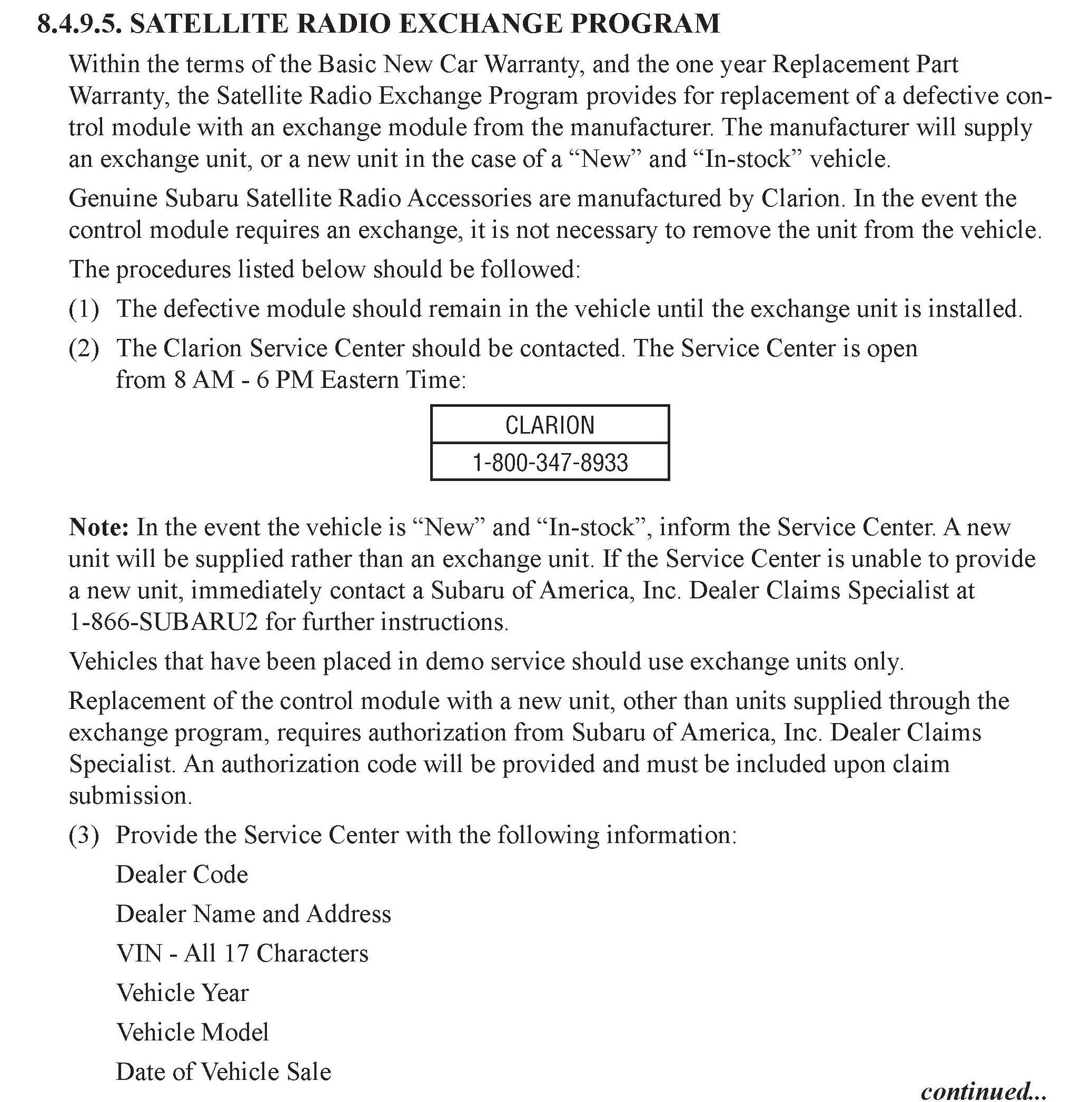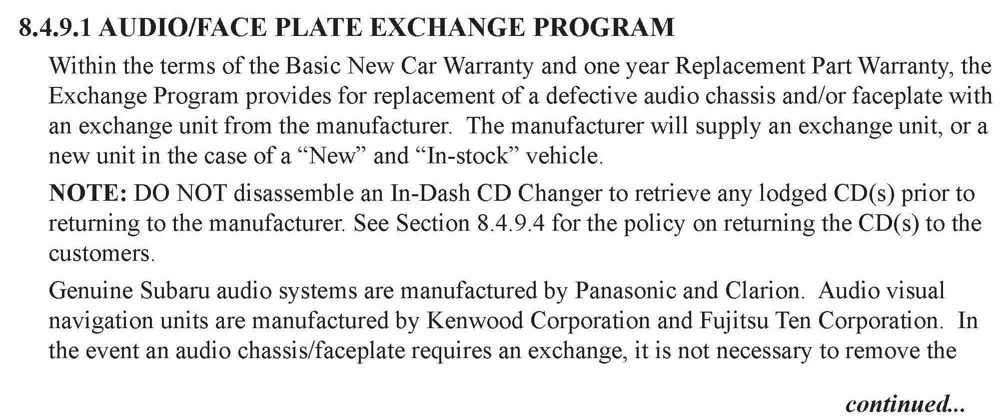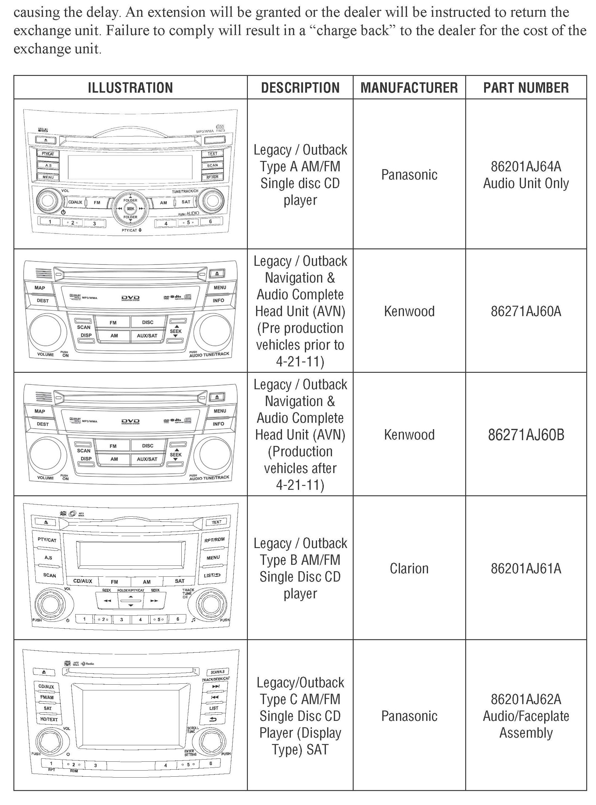 This bulletin contains illustrations of exchange components and their manufacturer as well as a description of the proper exchange procedure. The exchange program policy can also be found in Sections 8.4.9 and 11.2.10 of your Service Policies and Procedures Manual found in subarunet