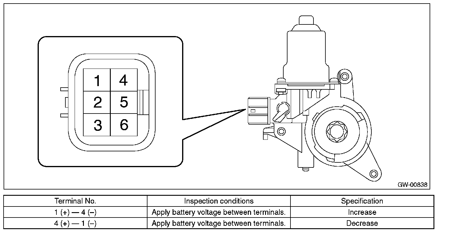 2. Apply battery voltage between the motor connector terminals and check the motor operation.