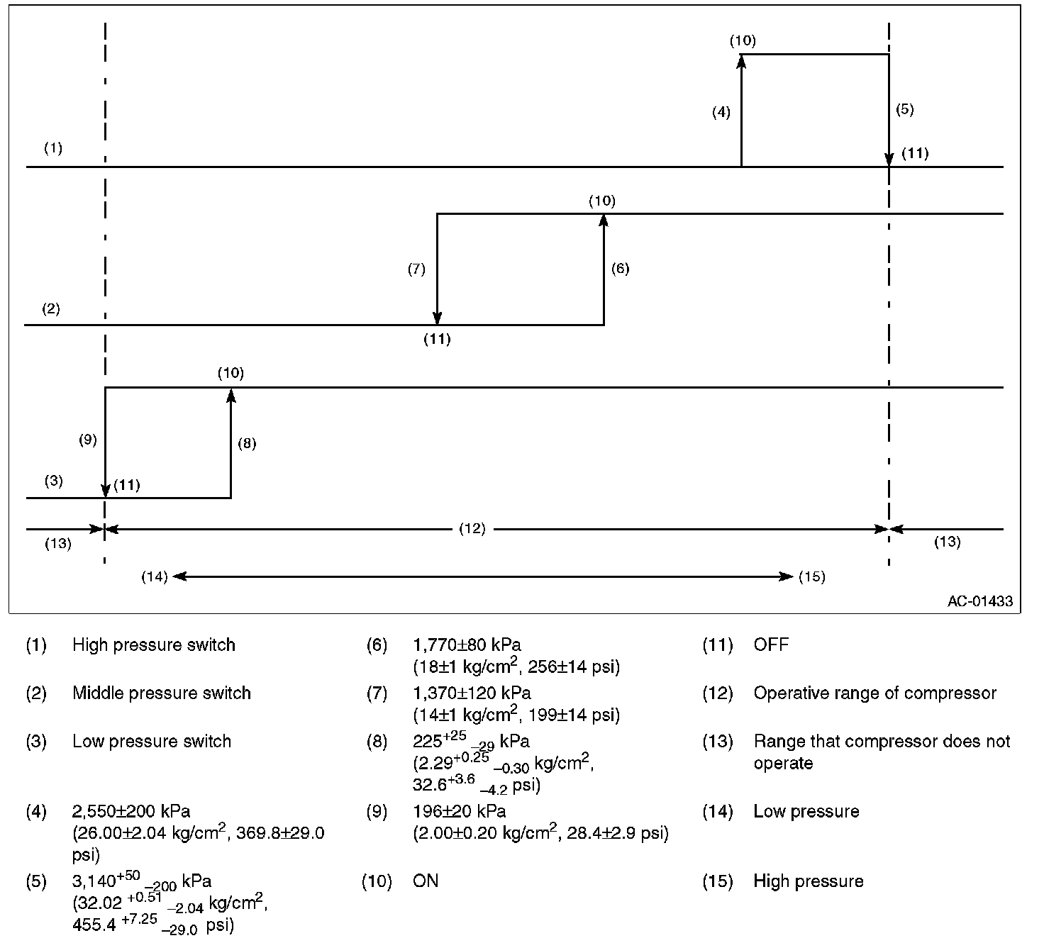 2. Start the air conditioner, and check the operating pressure of switch by turning the compressor (magnet clutch) to ON/OFF. Operation of each switch is as follows.