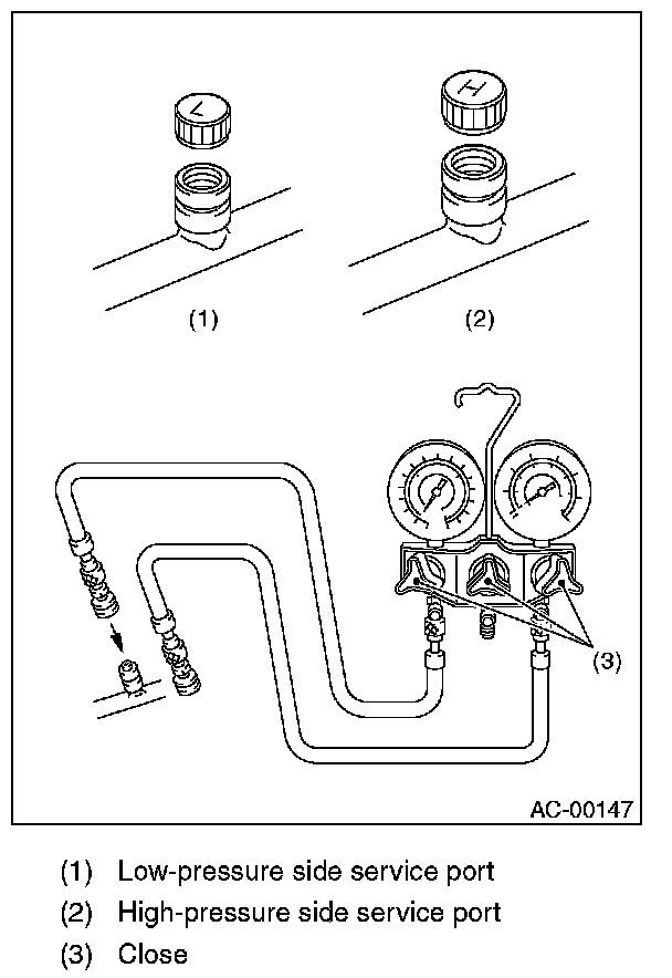 6. Leave alone for 5 to 10 minutes after closing the low pressure side and high pressure side valves, and check whether there is any change in the low pressure gauge needle indication. If the needle position changes, this indicates a leak. Check the pipe and hose connections, and repair the location with the problem. In this case, repeat again from step 1).