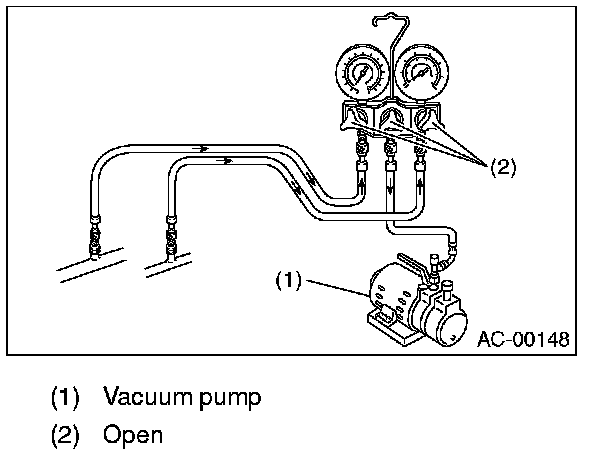 4. Operate the vacuum pump and open the low pressure and high pressure side valves. Next, open the center manifold hose valve, and begin evacuation.