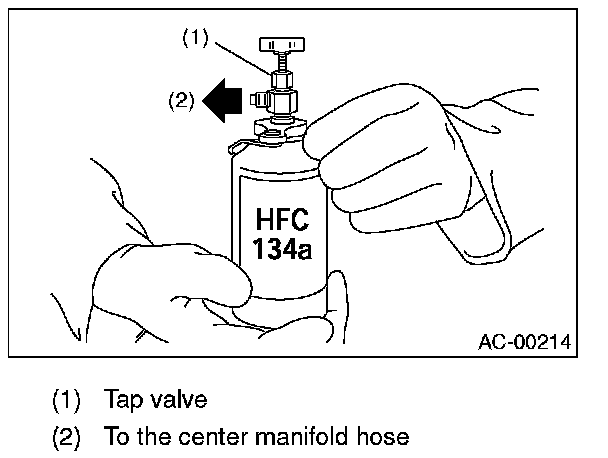 18. If the HFC-134a supply container becomes empty, close all valves, and close the can tap valve to replace the empty container. After replacing with a new HFC-134a supply container, perform air purge, and resume the filling operation.