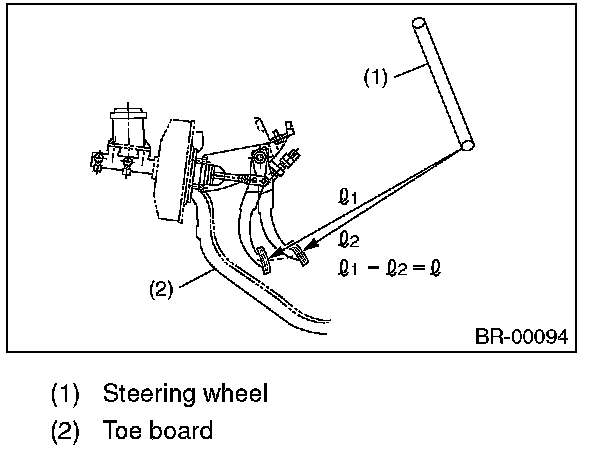 Run the engine at idle after warming up the engine, and depress the brake pedal with a force of 500 N (51 kgf, 112 lb). Measure the distance between the brake pedal and steering wheel. Release the pedal, and measure the distance between pedal and steering wheel again.
