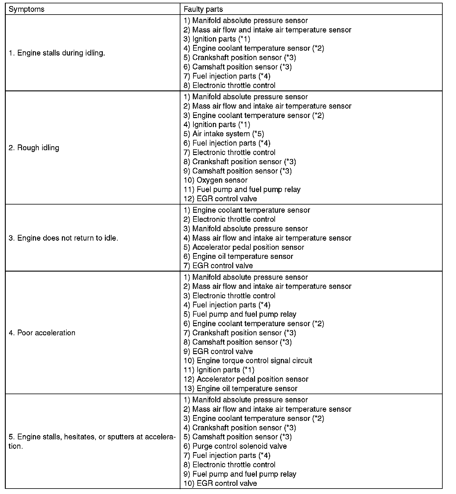 Malfunction of parts other than those listed is also possible.