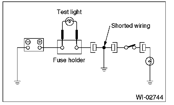 Connect a test light (rated at approx. 3 watts) in place of the blown fuse and allow current to flow through the circuit. Disconnect one connector at a time from the circuit. Starting with the one located farthest from the power supply. If the test light goes out when a connector is disconnected, the wiring between that connector and the next connector (farther from the power supply) is shorted.