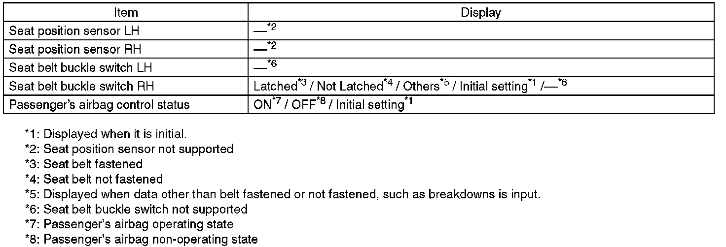 Check the operating condition of each sensor in the event of malfunction in the seat belt buckle switch, or when the seat belt buckle switch has been replaced.