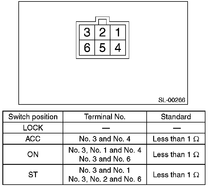 4. Turn the ignition key plate to each position and check the continuity between terminals of ignition connector.