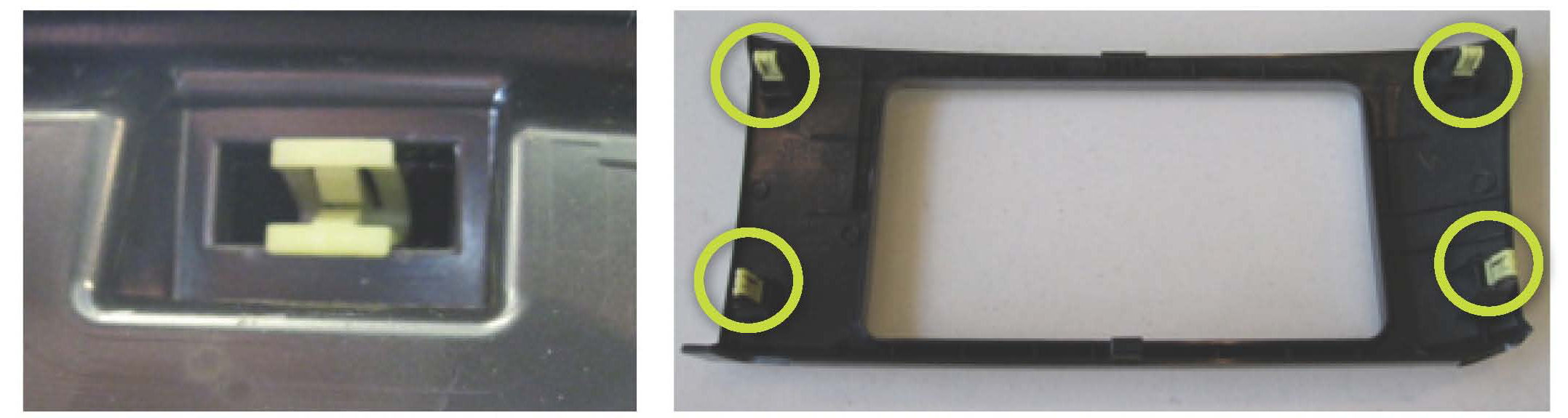 After removing the navigation / audio unit trim panel, confirm there are no retaining clips remaining in the instrument panel as shown in the photo below left. All 4 clips must be returned to the panel before reinstallation.
