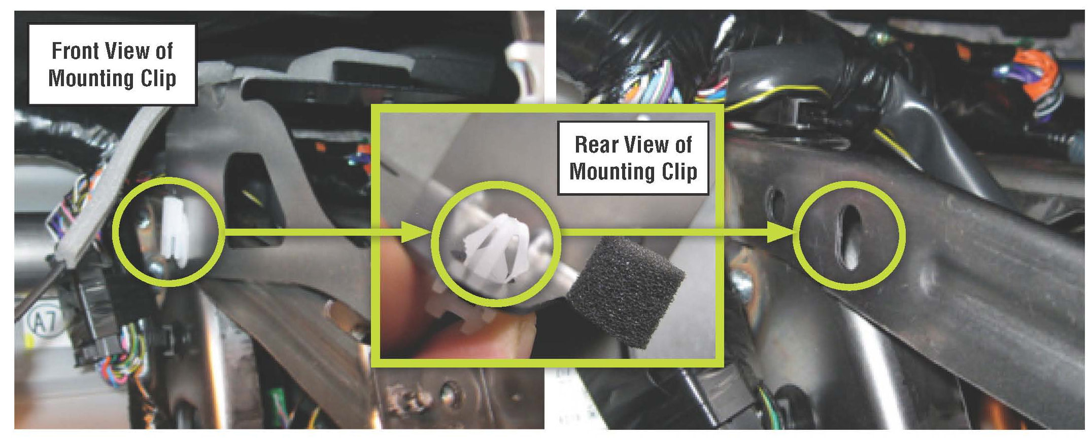 Install the revised GPS antenna / mounting bracket assembly. Confirm the white plastic mounting clip locks into the large oblong hole in the instrument panel support bracket properly before installing the mounting screw. CAUTION: Do not over-tighten the mounting screw.