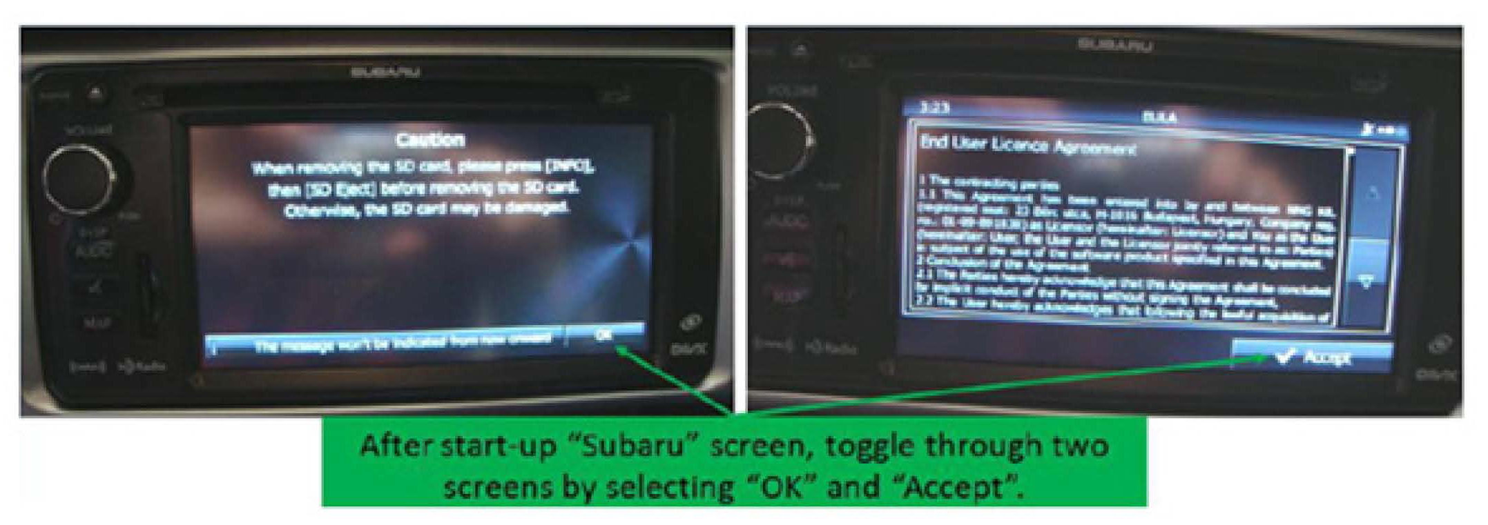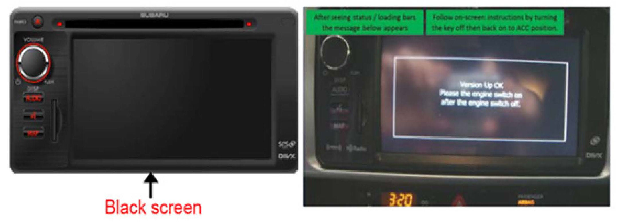 Until the programming process is completed, do not turn the ignition key or push start switch off or attempt to start the engine. Any interruption during the programming process can damage the unit's internal navigation data in which case, the audio / navigation unit will need to be replaced. After turning the ignition key or push-start switch on, the screen will remain black for about a minute while the reprogramming process is running. Once the status/loading bars complete and the "Version Up OK" message appears, cycle the ignition key off then back on to the "ACC" position.
