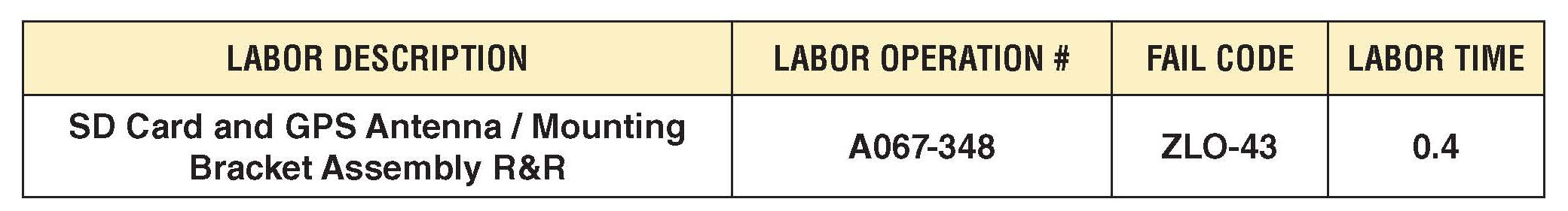Be sure to verify the condition(s) as described by the customer is within the context of this bulletin before performing any repairs. After verification, order the revised GPS antenna / mounting bracket assembly through normal parts channels. Request the exchange SD card by submitting a COMPLETED Fujitsu-Ten Exchange Fax Form. Once you have received BOTH components, continue with the rest of this procedure as they must be installed at the same time.