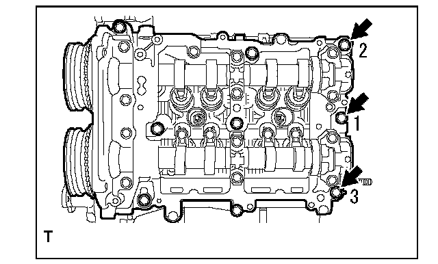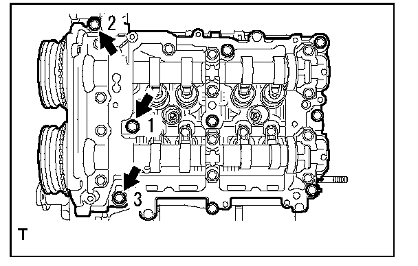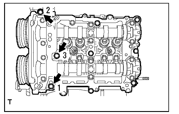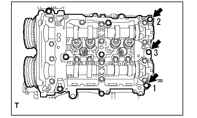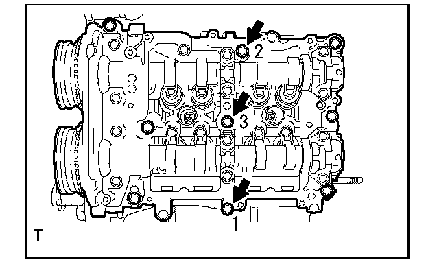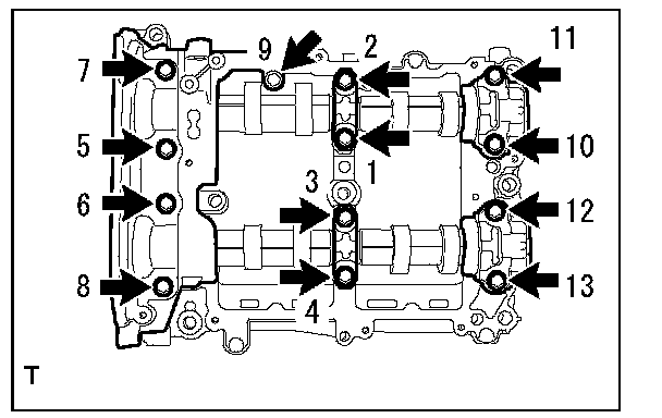 Camshaft Cap Torque and Sequence, Bank 2 Side:Tighten the 13 bolts in the order as shown in the figure and install the front camshaft cap LH, intake center camshaft cap LH, intake rear camshaft cap LH, exhaust center camshaft cap LH and exhaust rear camshaft cap LH.