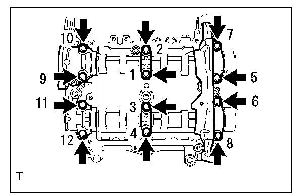 Tighten the 12 bolts in the order as shown in the figure and install the front camshaft cap RH, intake center camshaft cap RH, intake rear camshaft cap RH, exhaust center camshaft cap RH and exhaust rear camshaft cap RH.