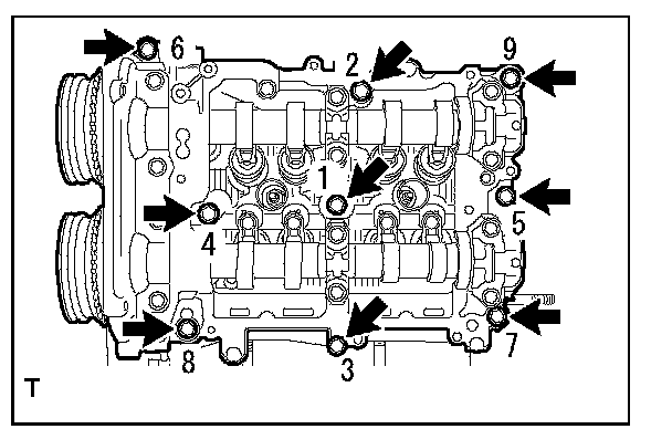 Tighten the 9 bolts in the order as shown in the figure to install the camshaft housing SUB-ASSY LH.