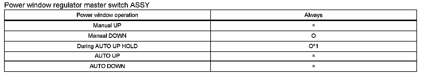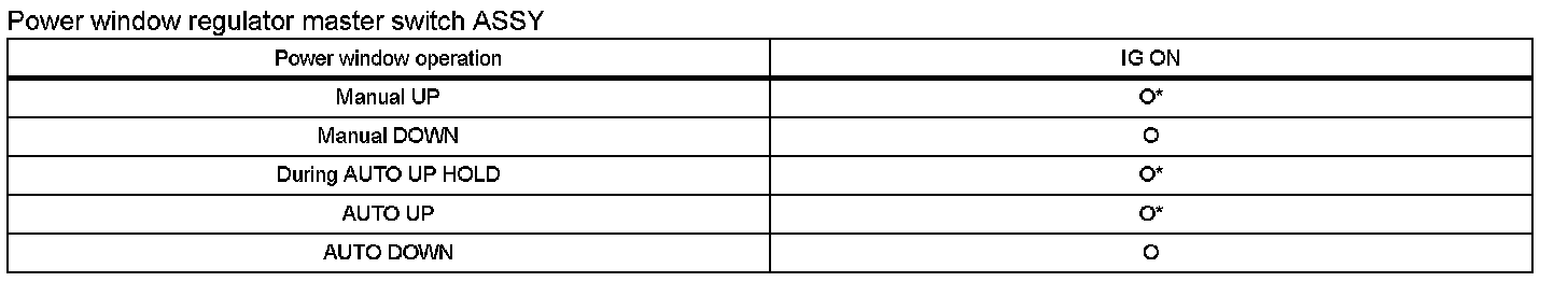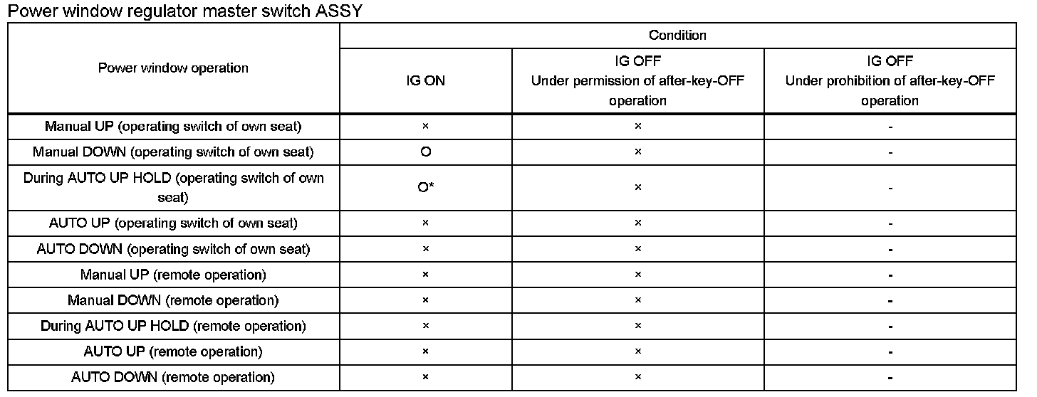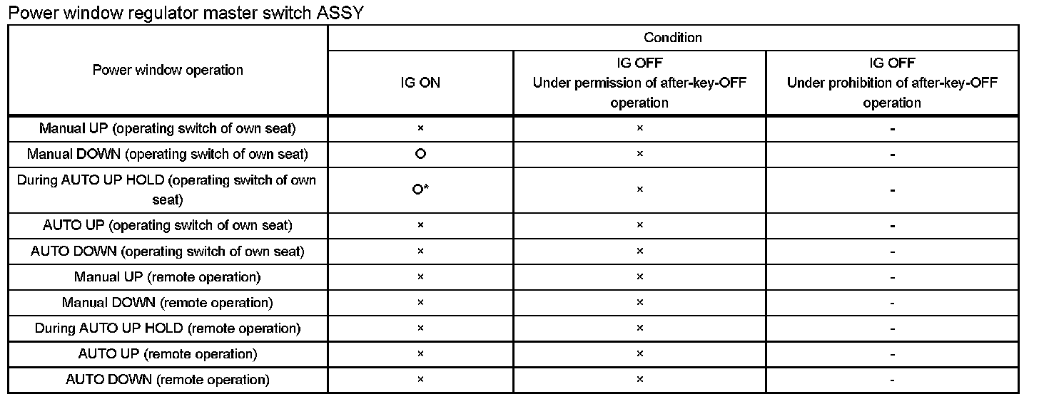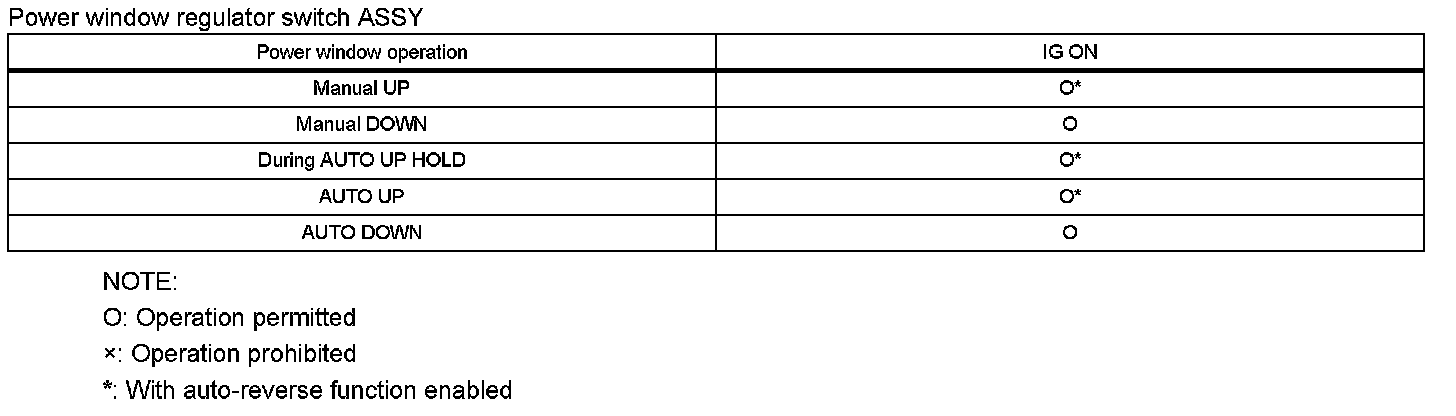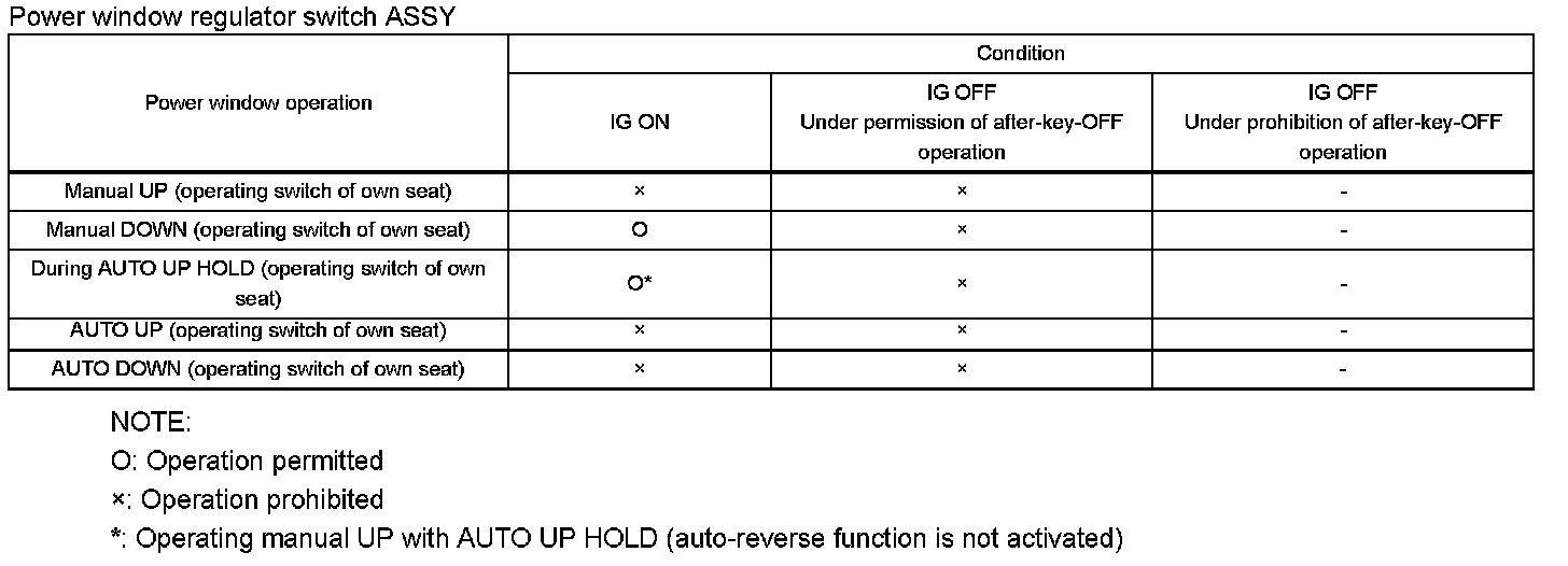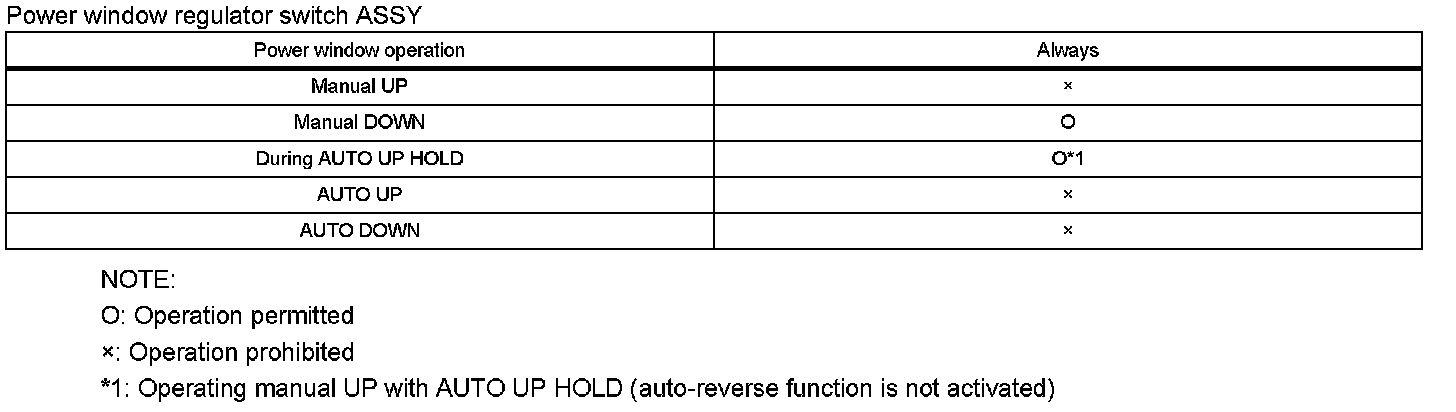 1. If any malfunction occurs on the pulse sensor for the auto-reverse function trigger, or any irregularity exists on window position or learned value, the following power window operations are prohibited.