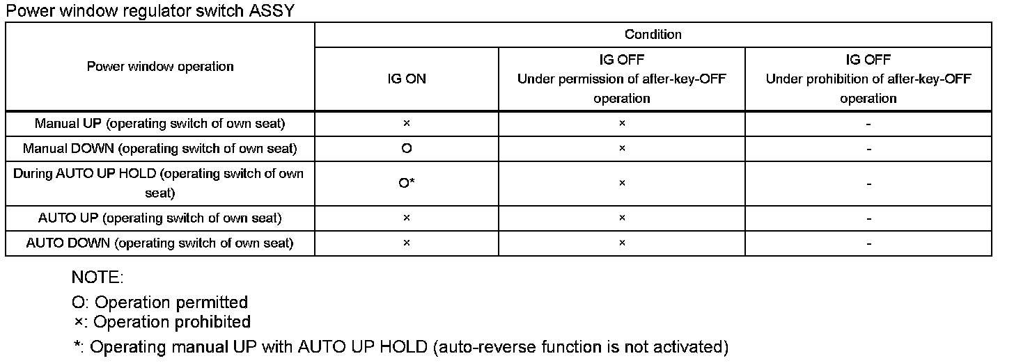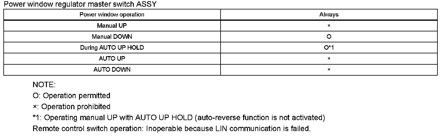 Own seat's SW operation: Because LIN communication is in failure, the status of the IG signal is unknown, therefore UP operation without auto-reverse function control is prohibited.