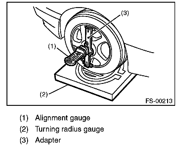 1) Place the front wheel on the turning radius gauge. Make sure the ground contact surfaces of the front and rear wheels are at the same height.