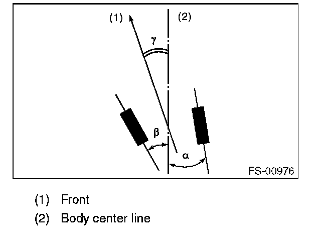 Thrust angle is a mean value of left and right wheel toe angles in relation to the vehicle body center line. Vehicle is driven straight in the thrust angle direction while slanting in the oblique direction depending on the degree of the mean thrust angle.