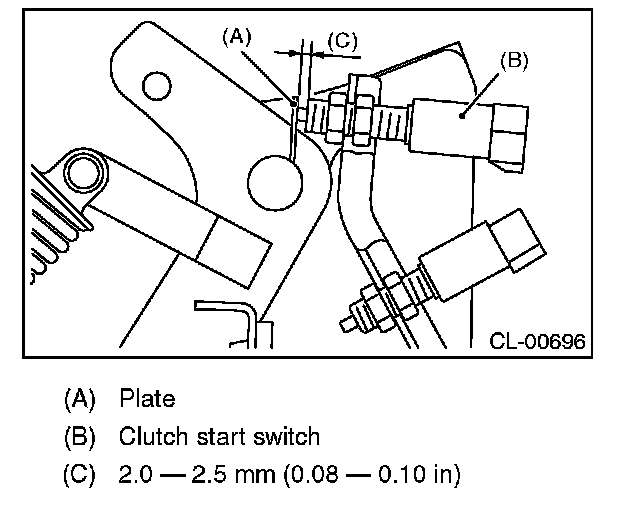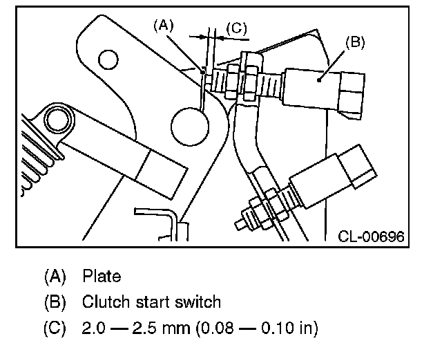 3) Adjust the gap of the clutch pedal plate and the clutch start switch to be 2.0 - 2.5 mm (0.08 - 0.10 in).