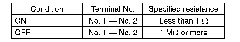 (2) Measure the resistance between terminal 1 and 2 of the switch. If the resistance is not within the specification, check the clutch stroke and installation condition, and check the clutch switch again.