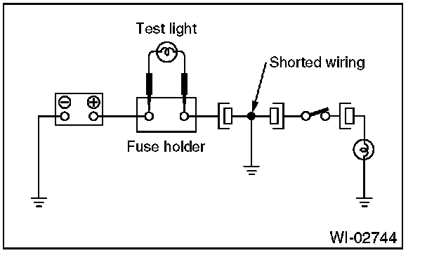 Connect a test light (rated at approx. 3 watts) in place of the blown fuse and allow current to flow through the circuit. Disconnect one connector at a time from the circuit. Starting with the one located farthest from the power supply. If the test light goes out when a connector is disconnected, the wiring between that connector and the next connector (farther from the power supply) is shorted.
