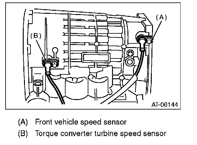 20) Remove the front vehicle speed sensor and torque converter turbine speed sensor.