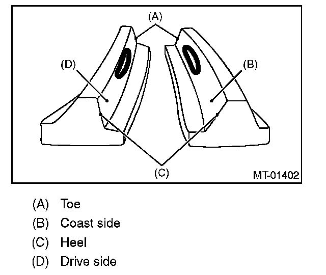 Check item: Tooth contact surface is slightly shifted toward the toe side under a no-load condition. (When driving, it moves towards the heel side.)