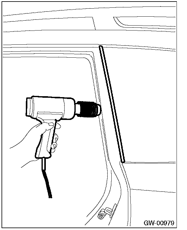 4. Heat the molding while moving the dryer up and down, and facing it to the molding from the side of the vehicle (vertically against the glass surface).