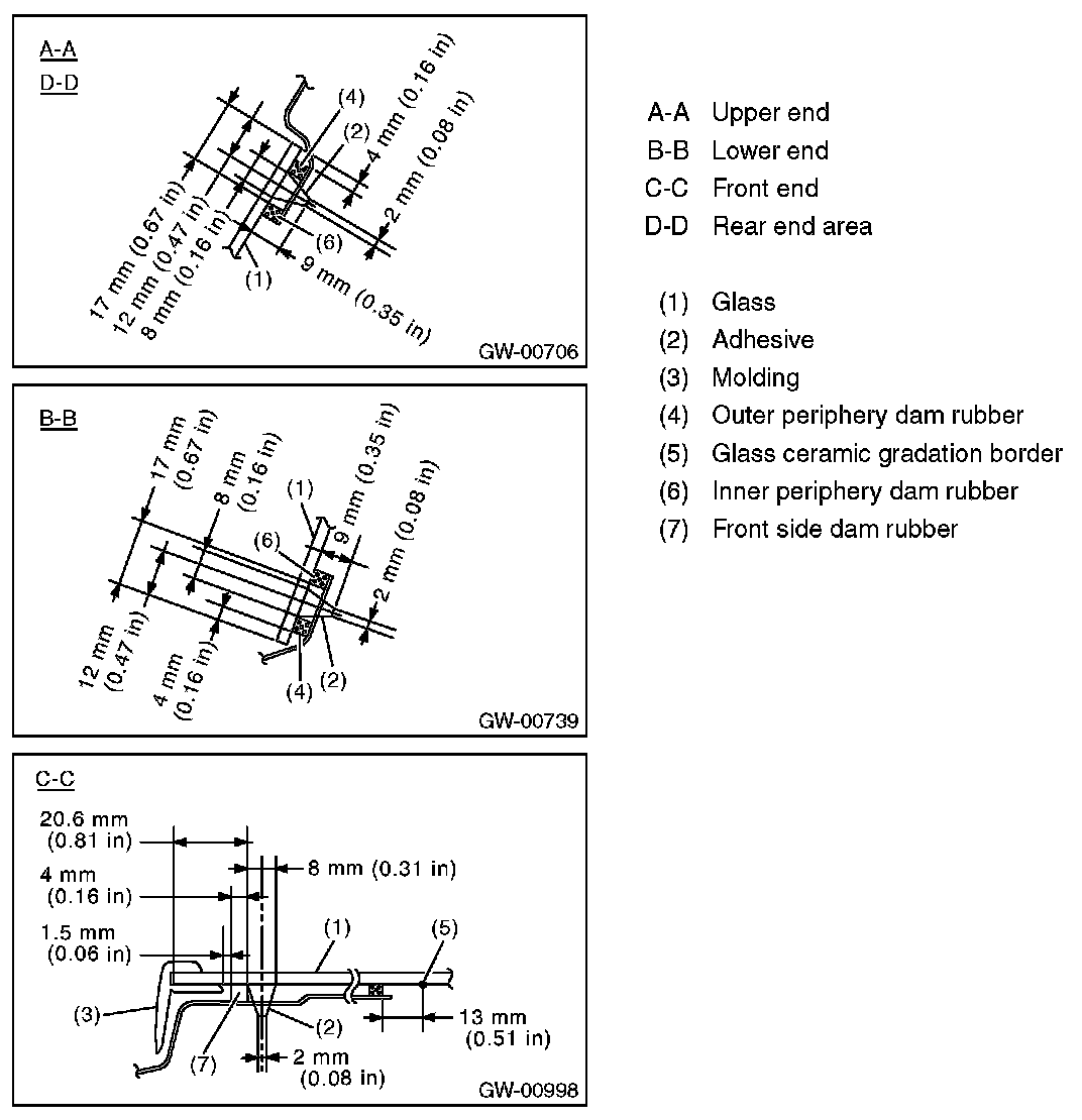 5. On the front end, attach the inner periphery dam rubber at a position 13 mm (0.51 in) from the border of the glass ceramic gradation, and for other locations 17 mm (0.61 in) from the end of the glass.