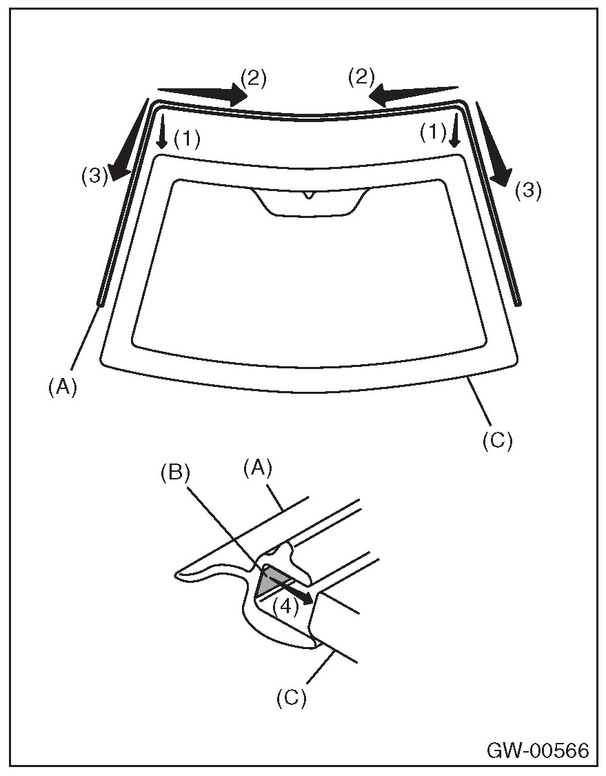 1. Align the molding (A) to the upper ends of the windshield glass (C).
